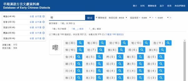 在檢索某漢字後,按“「X_」頻率”標籤,可看到出現在該檢索漢字後面首100個漢字及該搭配的共現頻率